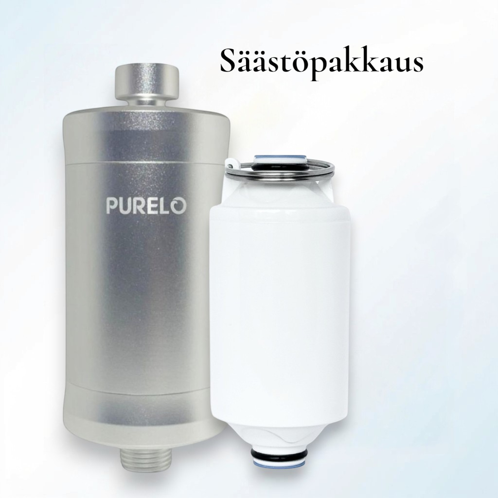 Pakkaus sisältää: Käyttövalmiin suihkusuodattimen sekä vaihtopatruunan suihkusuodattimeen.